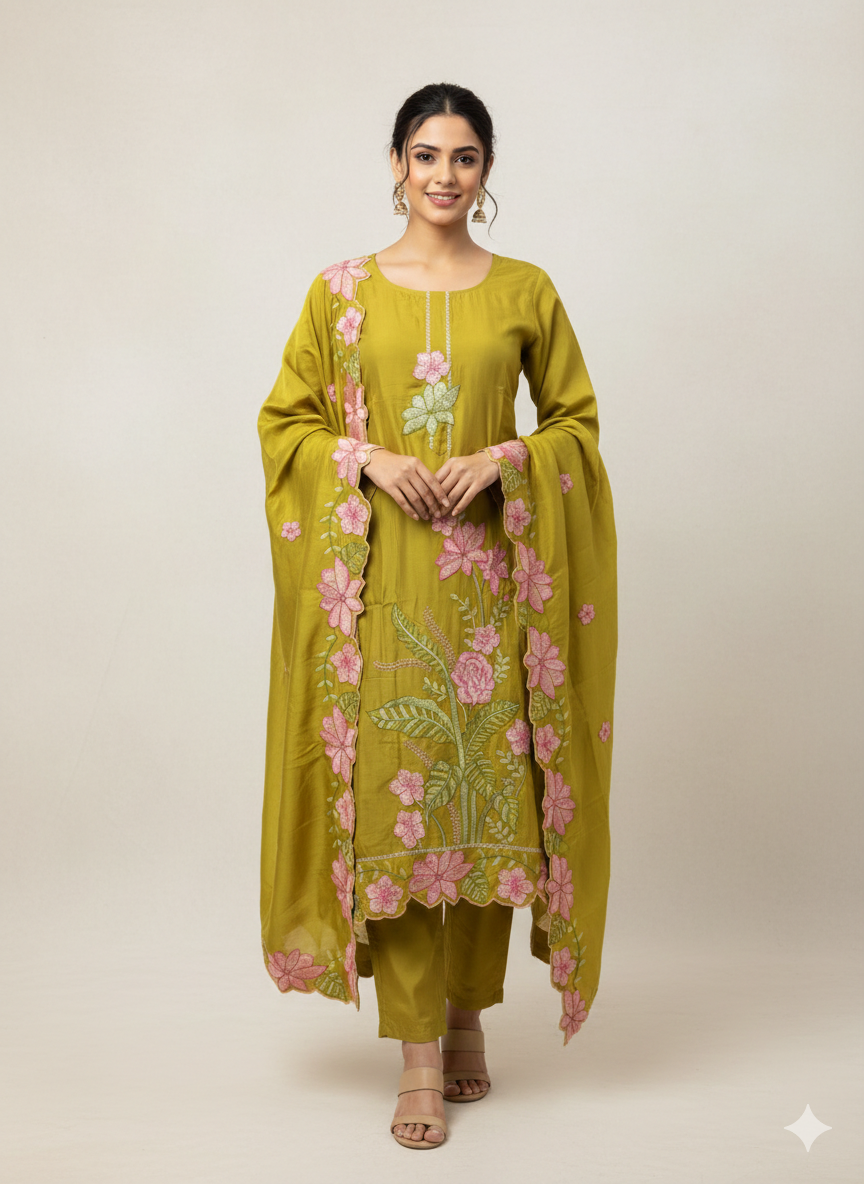 Add a vibrant touch to your wardrobe with this stunning mustard yellow premium 3-piece set, beautifully designed with rich floral embroidery. The elegant combination of pink and green thread work creates a graceful and eye-catching look, perfect for festive and special occasions.